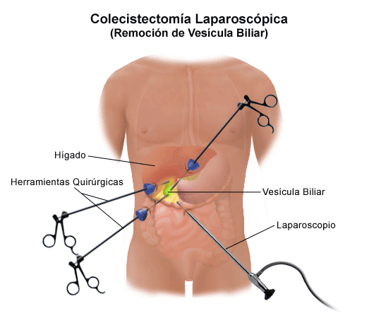 Colecistectomía Laparoscópica: Fue introducida en 1987 y en los '90 se ha convertido en uno de los procedimientos más comunes hoy en día. Esta cirugía se realiza con anestesia general, se introduce gas en la cavidad abdominal a través de una aguja, creando un neumoperitoneo. Luego se introducen 4 trocares pequeños (tubos) por donde pasan los instrumentos laparoscópicos y el laparoscopio para realizar el procedimiento. Esta cirugía se realiza observando un monitor con imagen amplificada y de buena calidad de la vesícula y otros órganos abdominales. La tasa de conversion por complicaciones es menor al 5 %. Este es un procedimiento de "Cirugía Invasiva Mínima", que se caracteriza por tener una recuperación muy rápida, un postoperatorio muy confortable, con mínimo dolor y con no más de 1 día en el hospital. En casos seleccionados se realiza en forma ambulatoria.